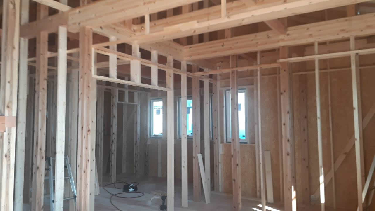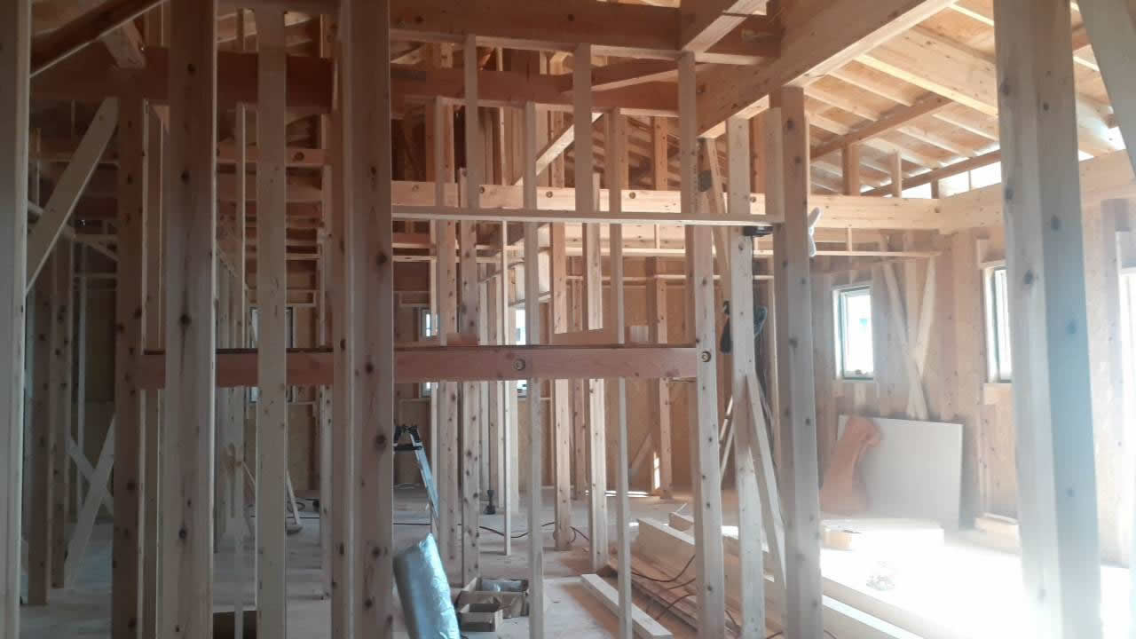 東御市M様の注文住宅の建前が終わり、本格的に建築作業が始まりました。 いよいよホビースタイル信州のデザイン住宅が形になっていきます。
