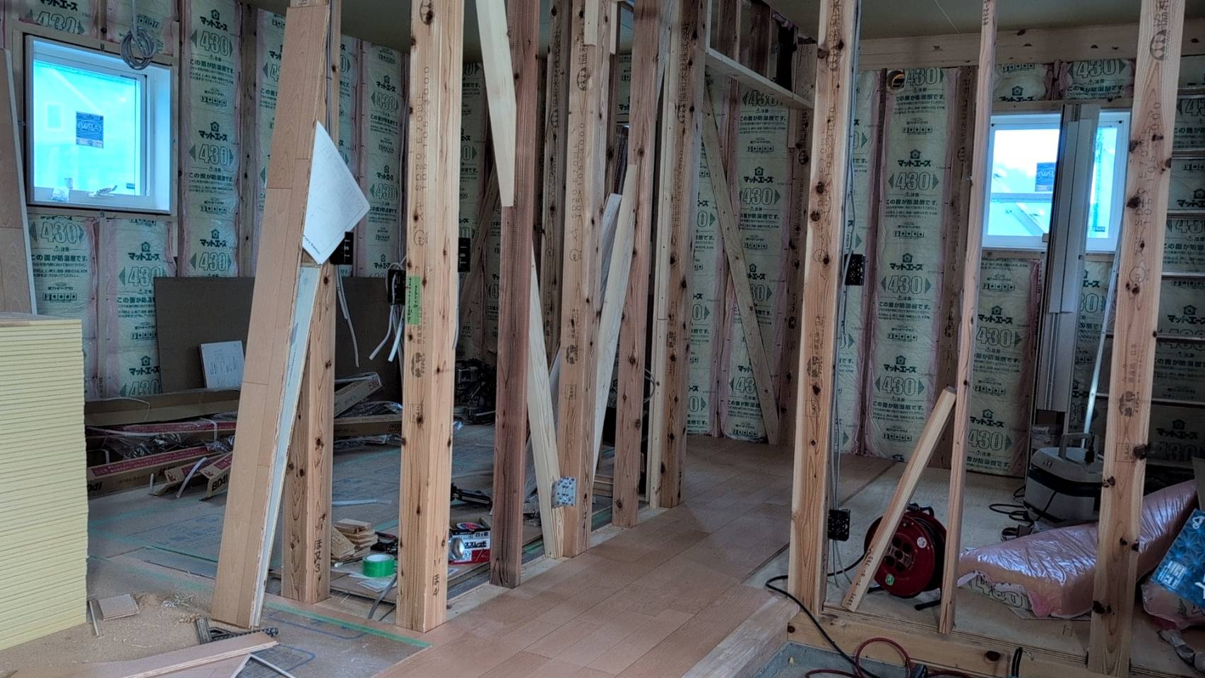青木村T様邸の注文平屋住宅の進捗のご報告です。 先日の建前から進みまして、断熱材や一部床材など内装の工事が進んでおります。 薪ストーブ用の煙突も取付が進んでおります。