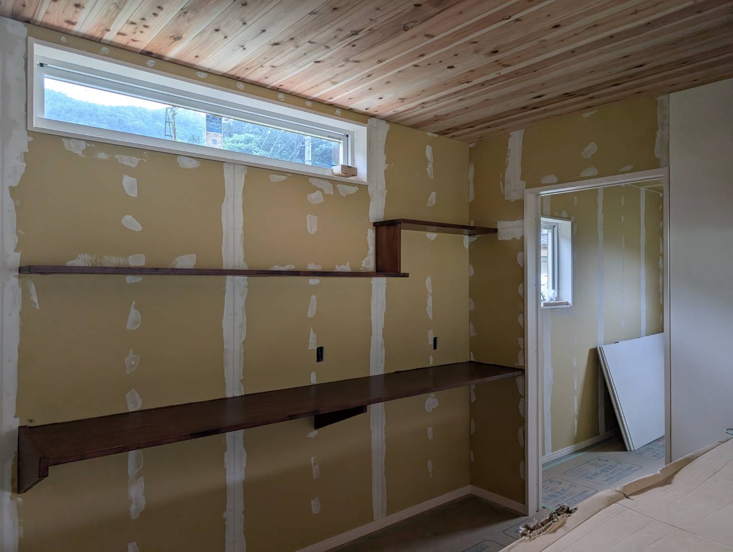庭へすぐに出ることができる大きな窓を設置しました。 内装の一部の壁は施主様ご自身で珪藻土を塗装される予定です。