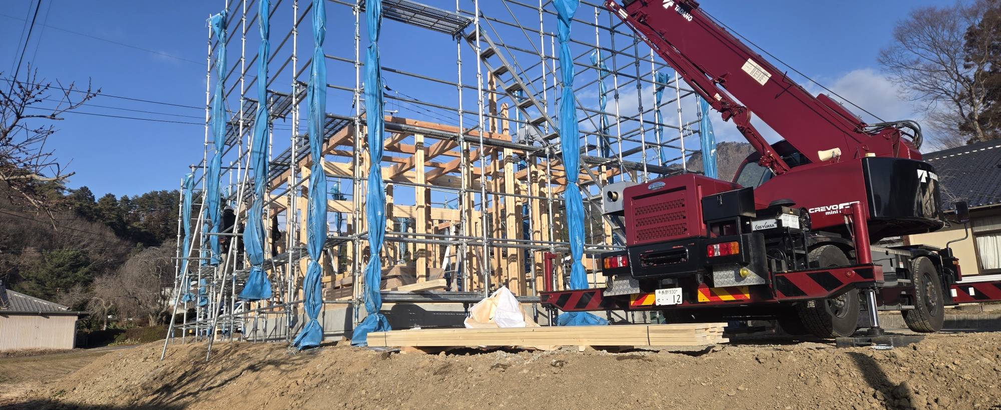 柱・梁・筋交いが組み上がり、建物の骨格がしっかりと形になってきました。